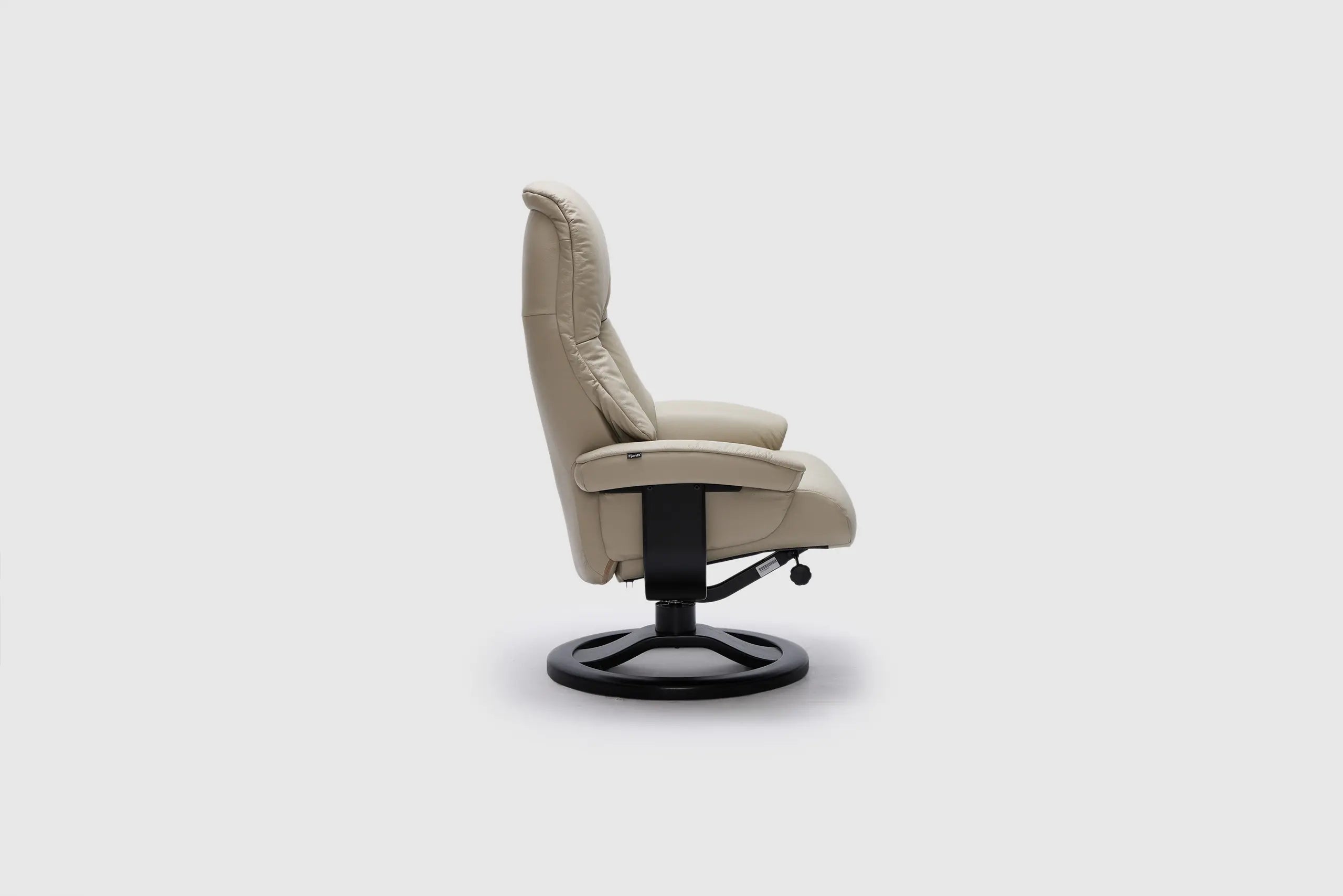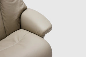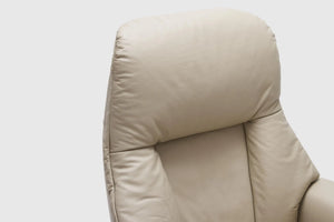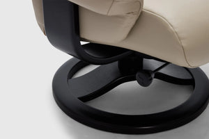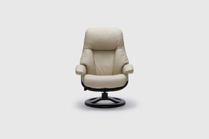 The Fjords Alfa recliner chair provides continuous support for your legs and back, with bases which have a 360° swivel. The base is produced in a stained laminate wood which gives it an elegant character. Available in all our leathers and select fabrics. the Alfa features a manual release adjustable headrest angle. The chair is available in two sizes, small and large.