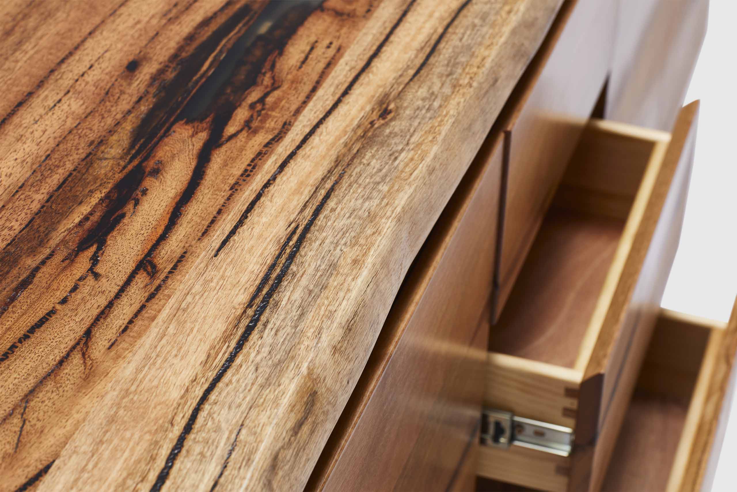 Marri is a hardwearing and durable timber, which while warm in tone, exhibits varying hues of gold, orange, peach and brown colours giving each piece a unique character and beauty. The contrast of the dark gum lines and light timber tones provides both a stunning contrast and a distinctive feature to the finished piece. Gum veins are skilfully crafted with precision & filled with either dark or clear resin exhibiting a raw beauty not seen in other timbers.
