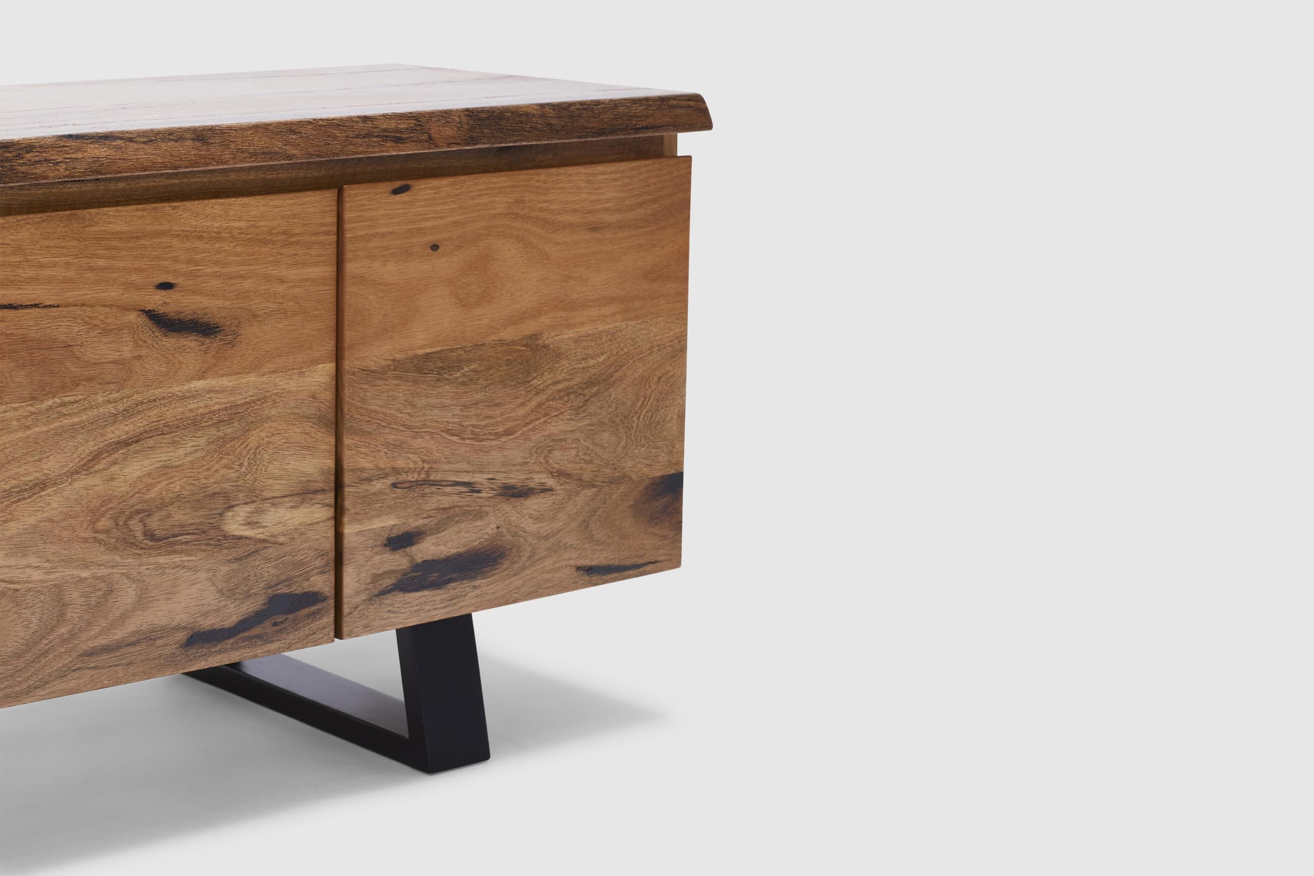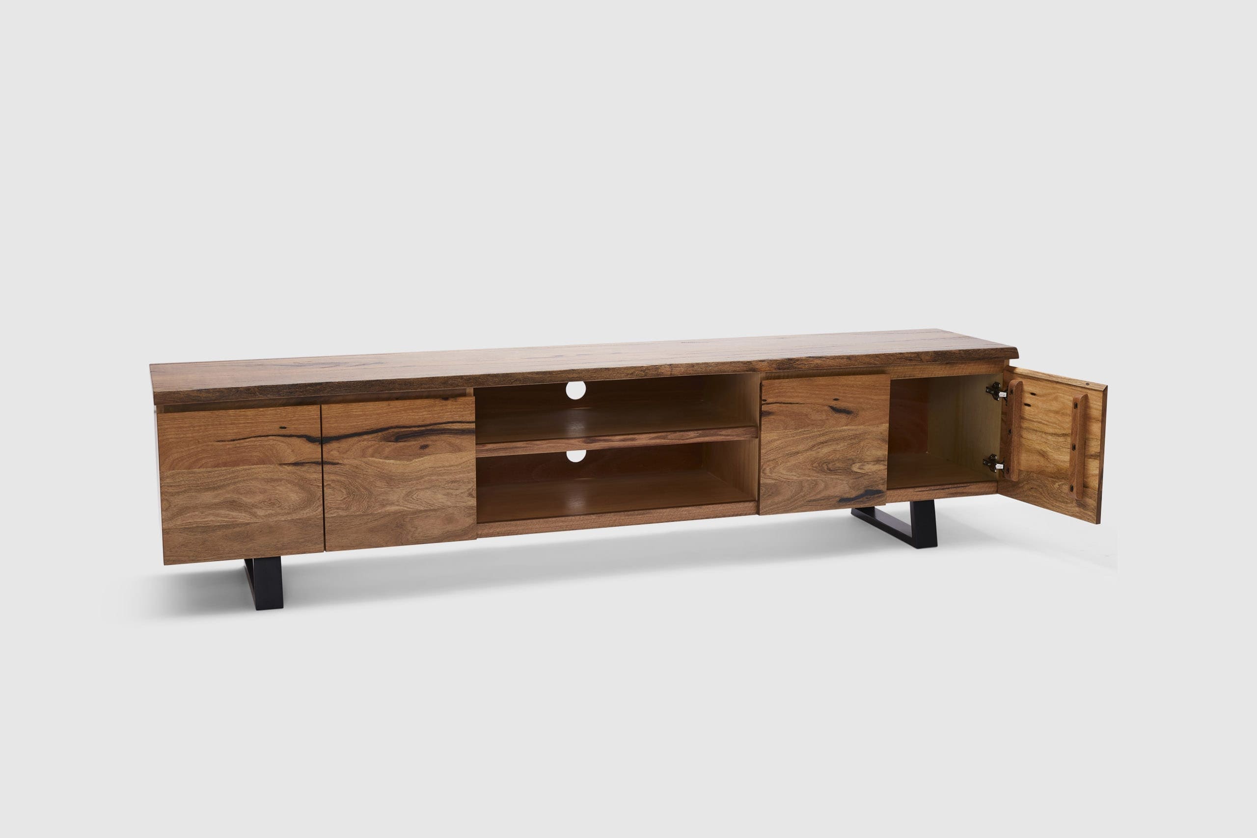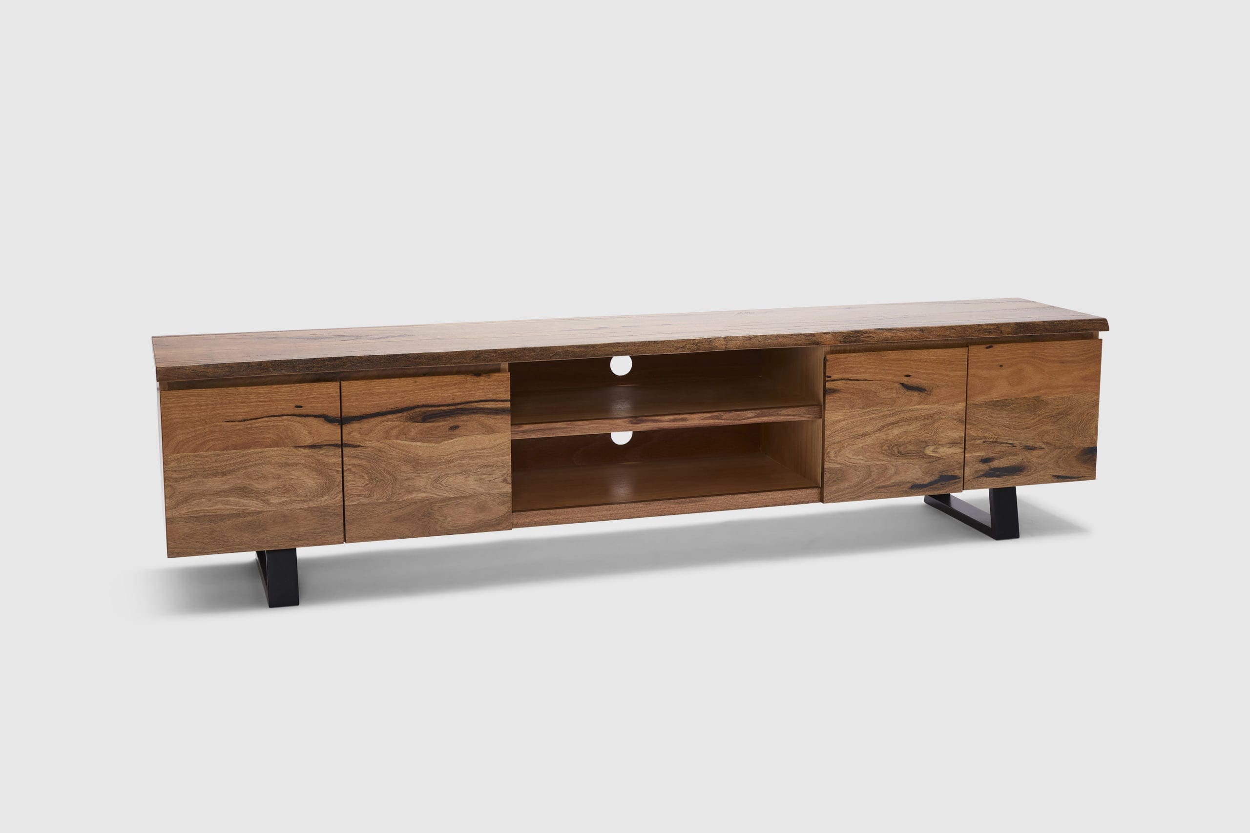 MORE CONFIGURATIONS & SIZESExclusive to Adriatic, our feature grade Amazon live-edge range is crafted from premium solid Marri timber sourced from Western Australia. It features 4 soft closing doors with concealed storage for console and devices, and is finished with elegant black timber legs.