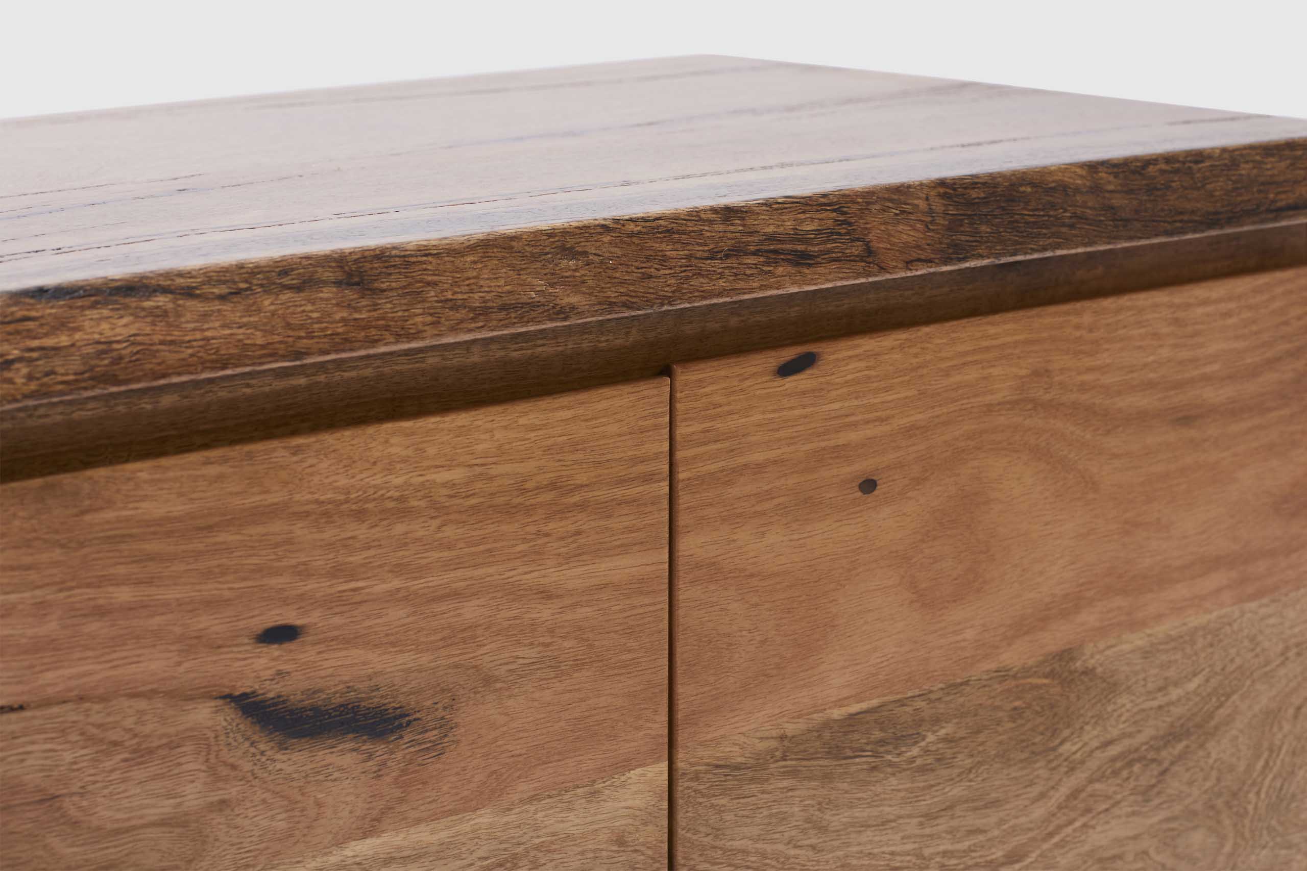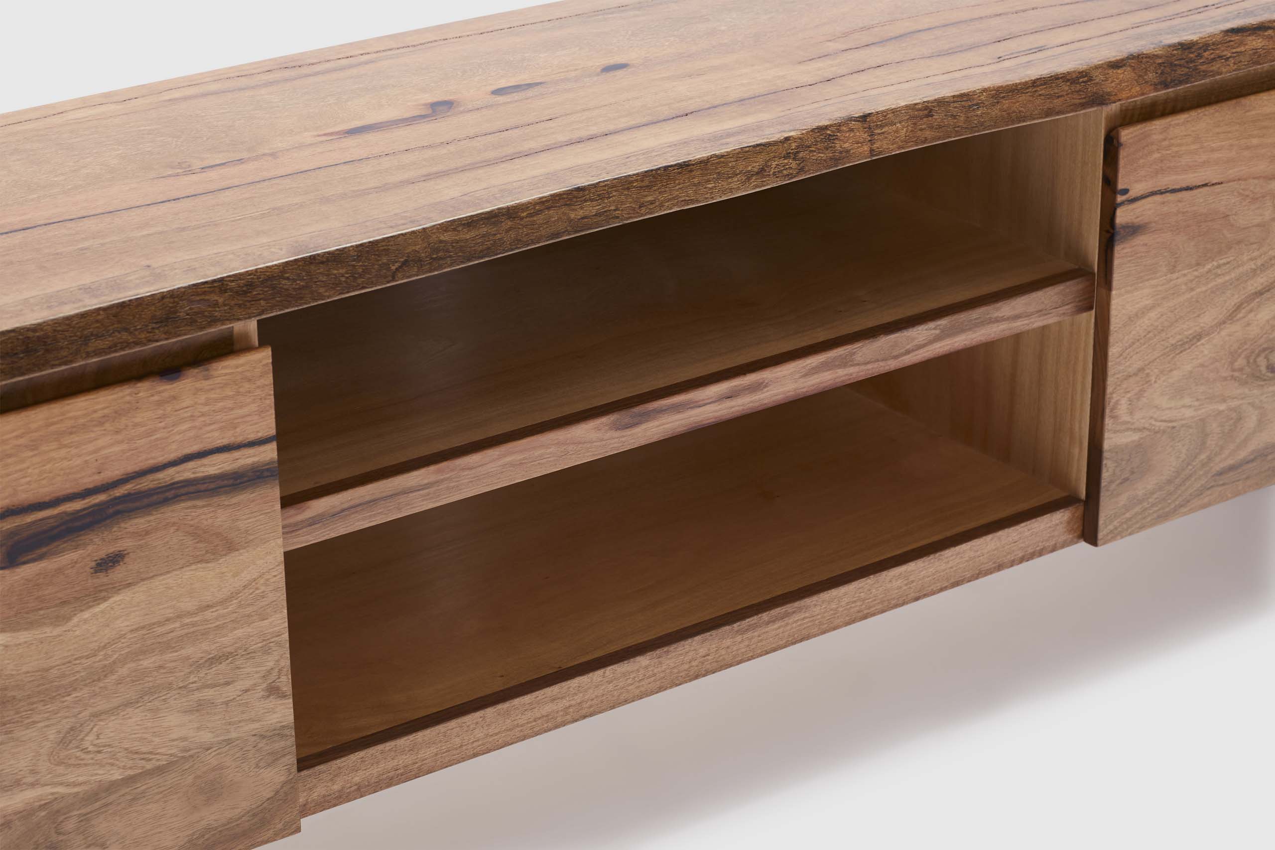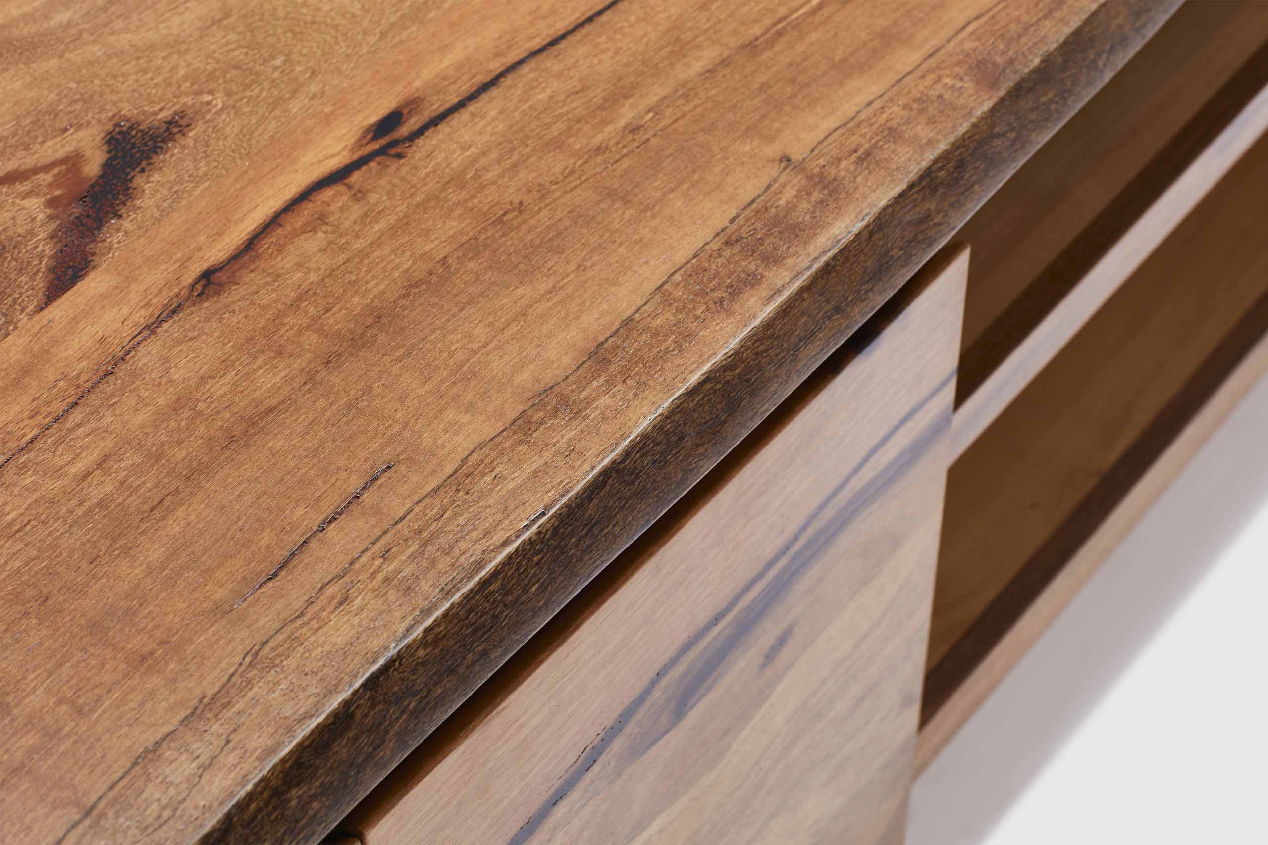 MORE CONFIGURATIONS & SIZESExclusive to Adriatic, our feature grade Amazon live-edge range is crafted from premium solid Marri timber sourced from Western Australia. It features 4 soft closing doors with concealed storage for console and devices, and is finished with elegant black timber legs.