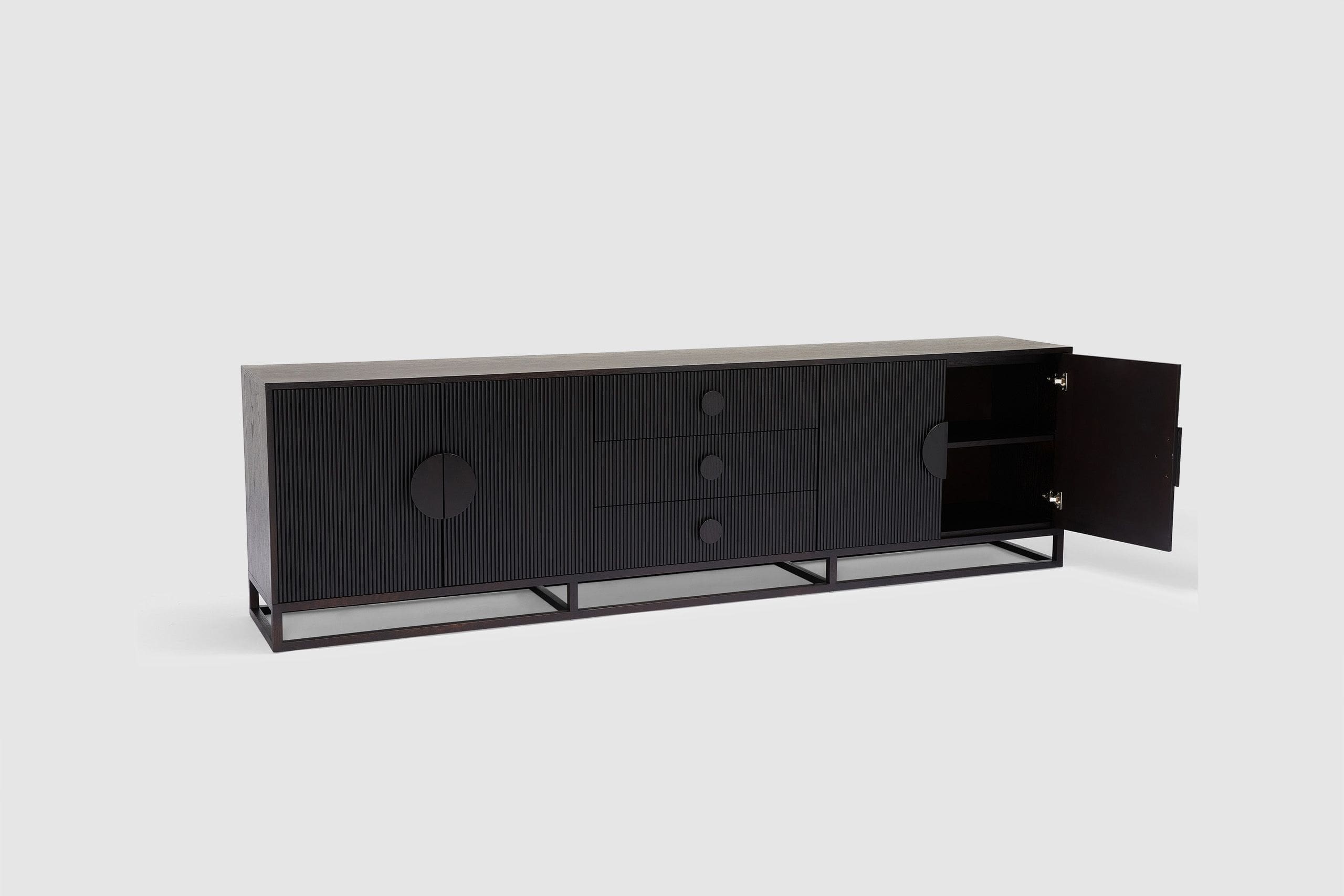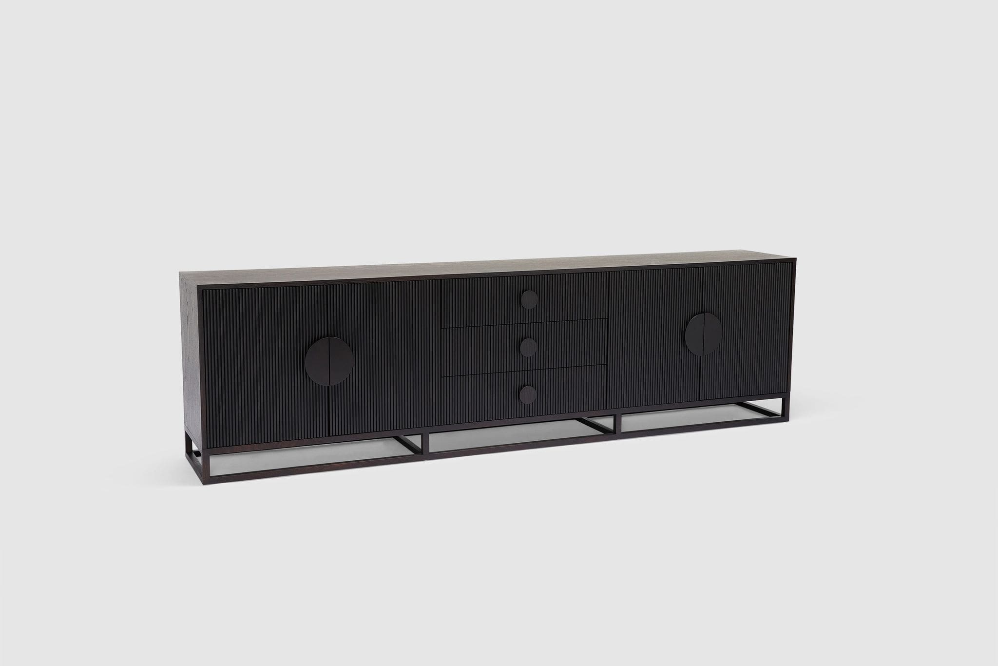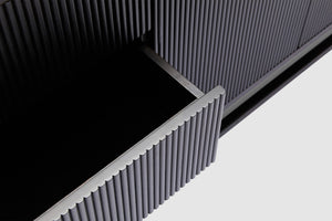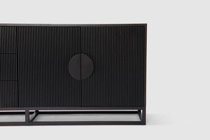 Boasting a sleek yet generous form, our Artie buffet is sure to be the anchor of any home. Four doors and three drawers feature circular handle designs, presenting subtle curved lines to the design, while the vertical wood slatted panels ensures this unit is an undeniable staple which elevates your space. The wide and generous size offers ample display and storage space. Full range includes matching dining table, entertainment unit, coffee table, and console.