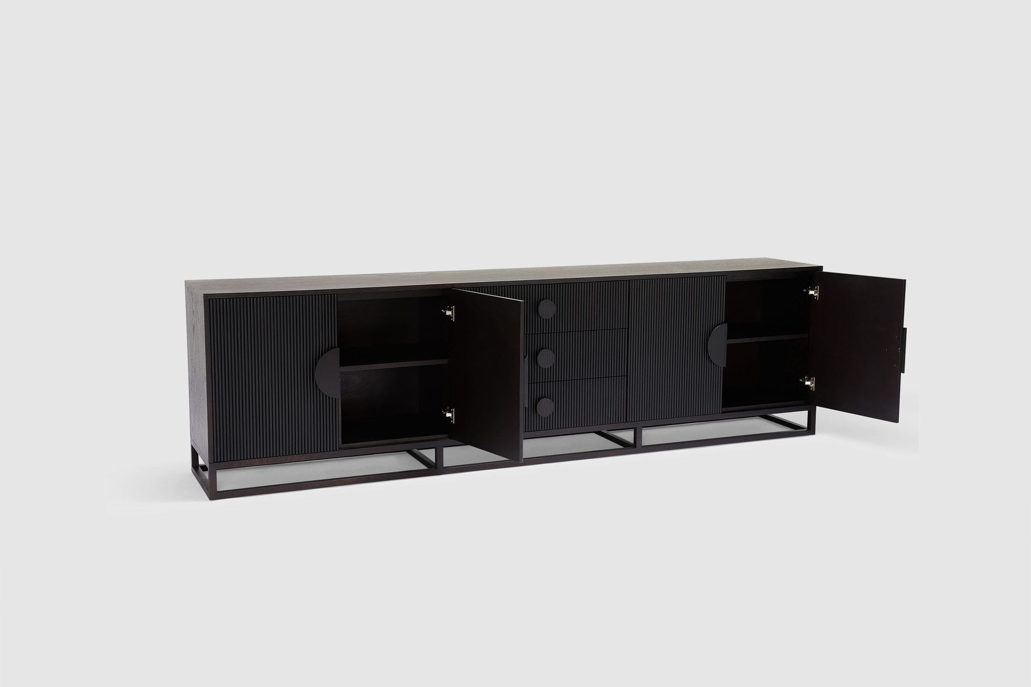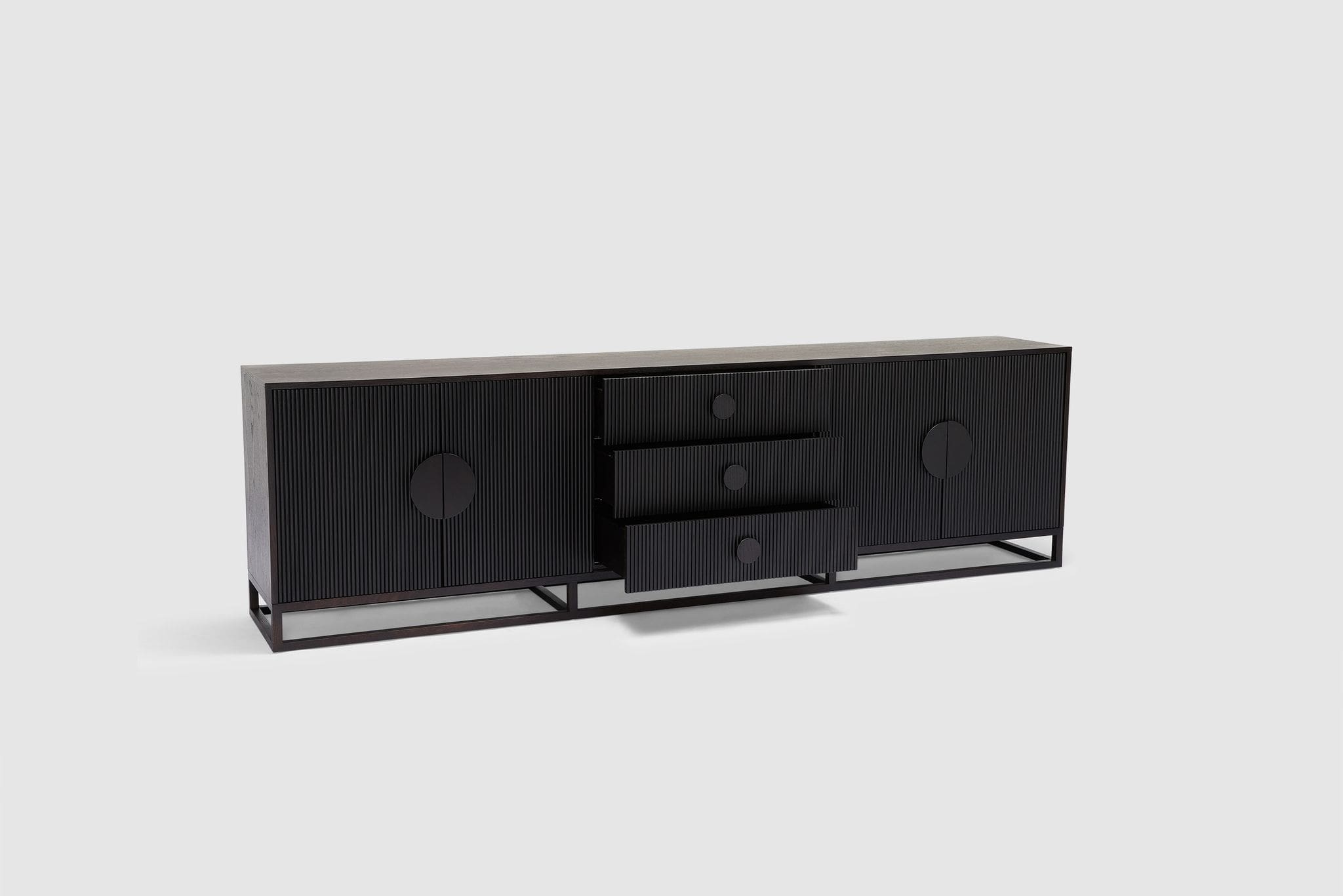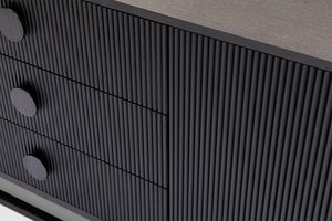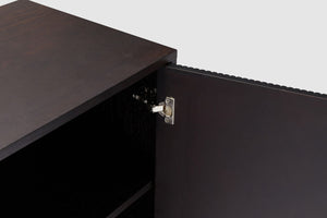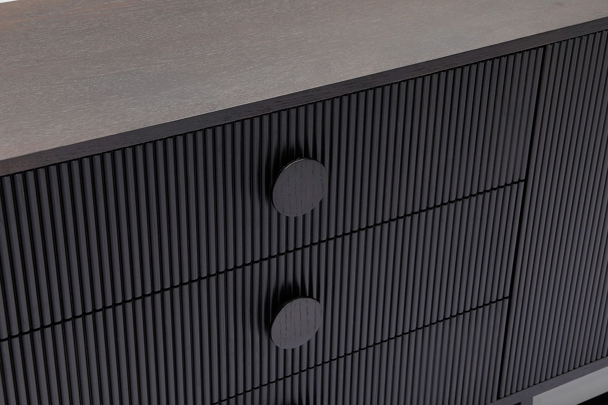 Boasting a sleek yet generous form, our Artie buffet is sure to be the anchor of any home. Four doors and three drawers feature circular handle designs, presenting subtle curved lines to the design, while the vertical wood slatted panels ensures this unit is an undeniable staple which elevates your space. The wide and generous size offers ample display and storage space. Full range includes matching dining table, entertainment unit, coffee table, and console.