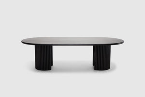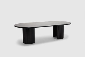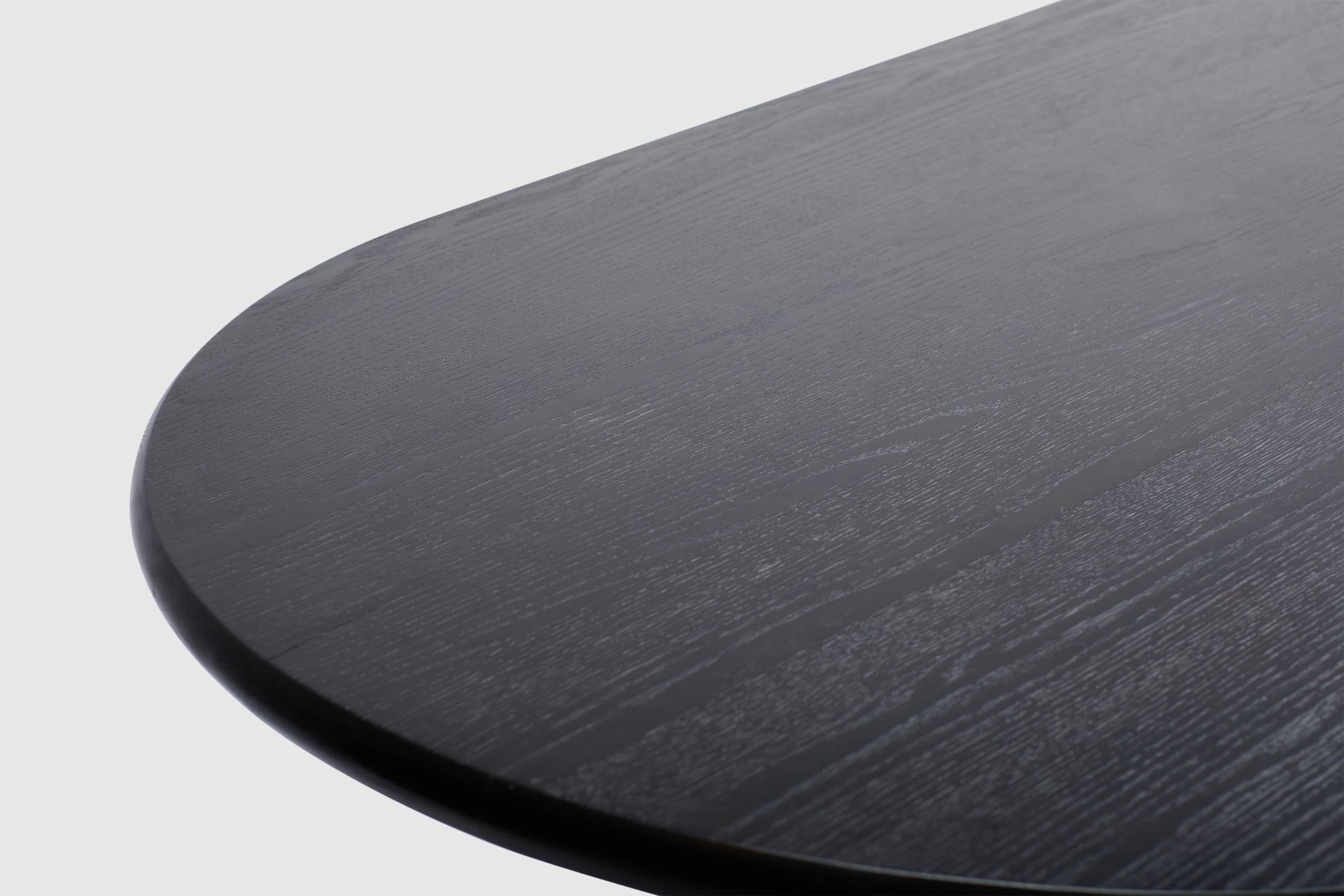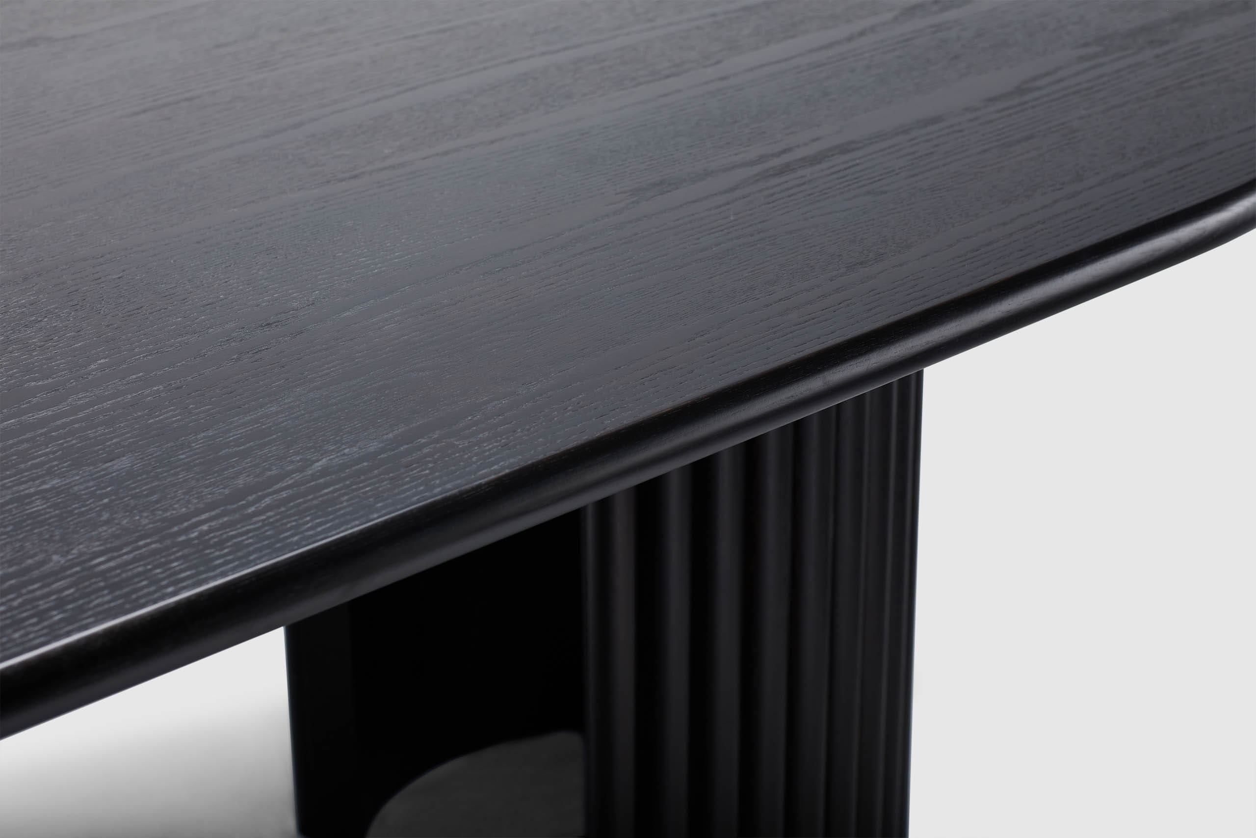 Artie explores shape and balance in American Oak. Bold crescent-curved legs and a broad oval top call attention to the wood's prominent grain, which is further accentuated with a seasoned wenge black stain finish. Contemporary sculpture with sophisticated simplicity, the perfectly proportioned Artie table accommodates the whole family when entertaining. The Artie range features a matching console, entertainment unit and credenza.