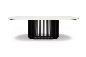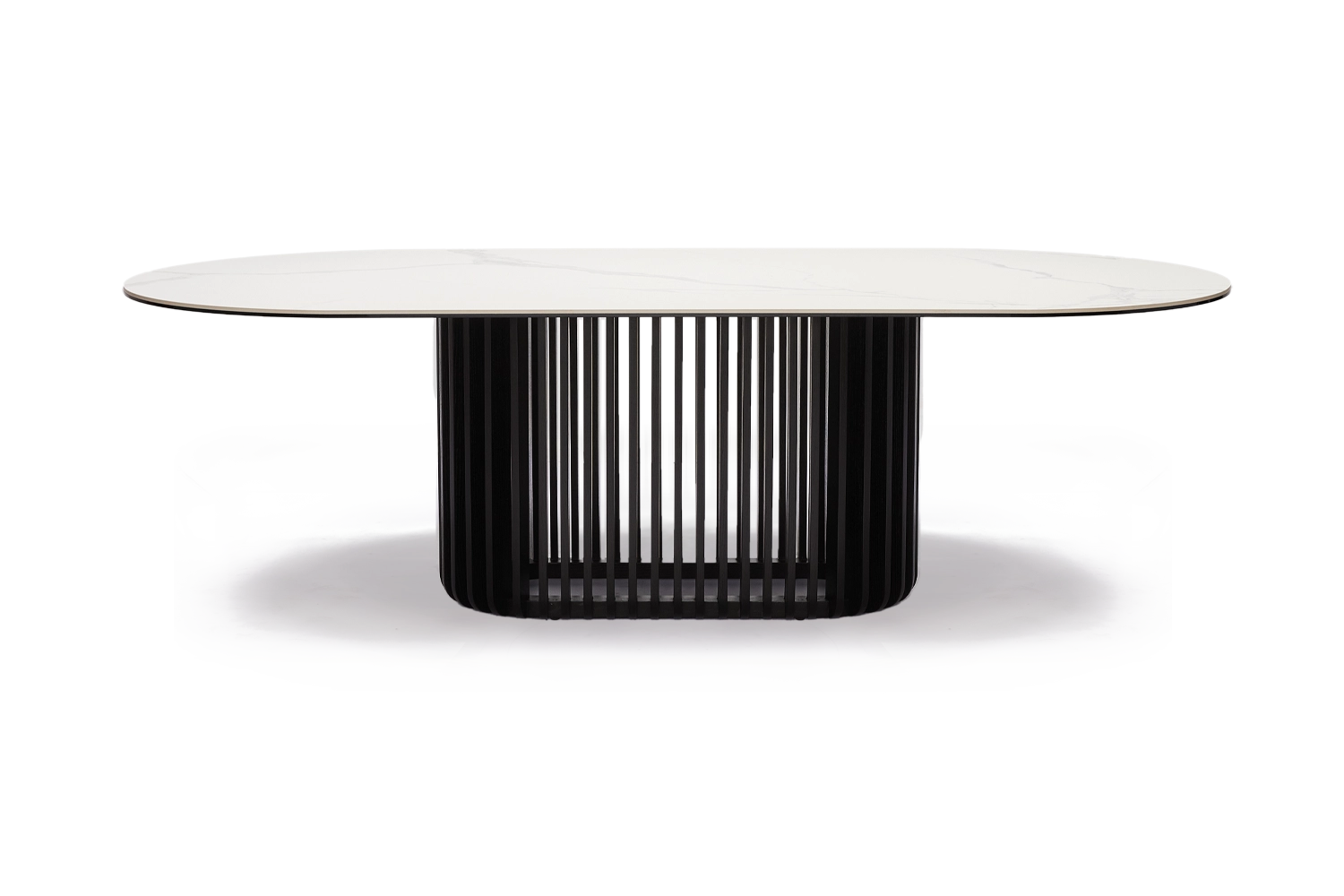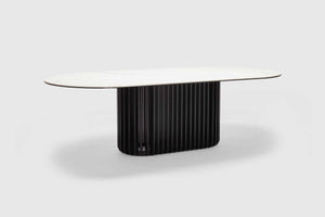 Bobo curves mid-century modernism in a new direction, mixing cool matt white ceramic and black oak timber in a forward-thinking oval design. An oval of pristine matt ceramic tops an elliptical base of oak timber, finished in matt black. With its slatted design, this base offers a unique look and visual interest. Exclusive to Adriatic - Bobo table looks sublime in any décor.