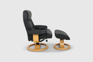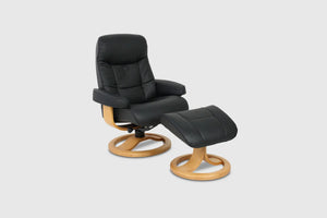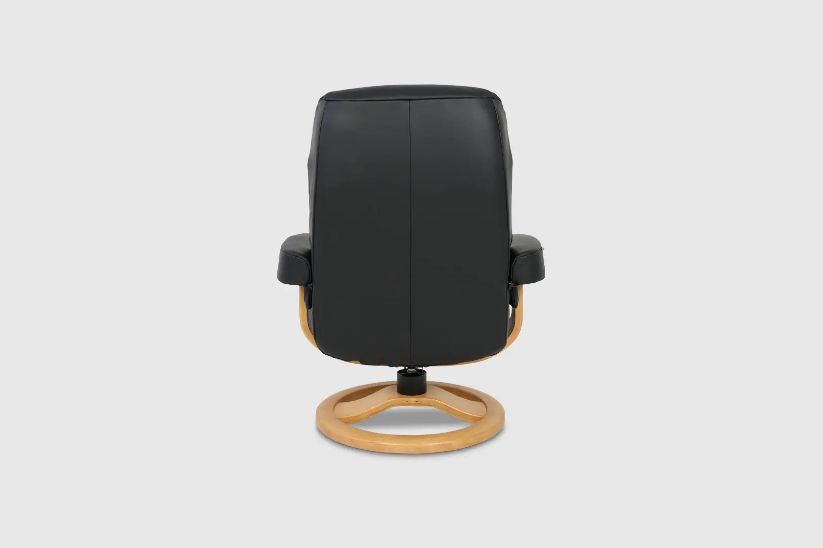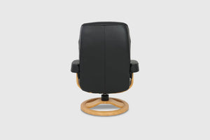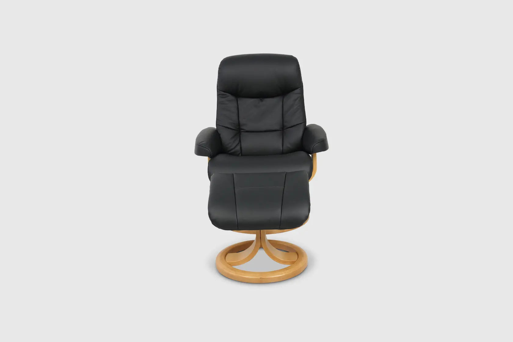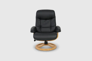 The Fjords Freya chair with variable adjustment provides continuous support and by means of our Fjords® Active Release System™ the neck angle is automatically adjusted while you recline, with bases which have a 360° swivel. The base is produced in laminated, stained wood which gives it an elegant character. Available in all our leathers and select fabrics. The chair is available in two sizes, small and large.
