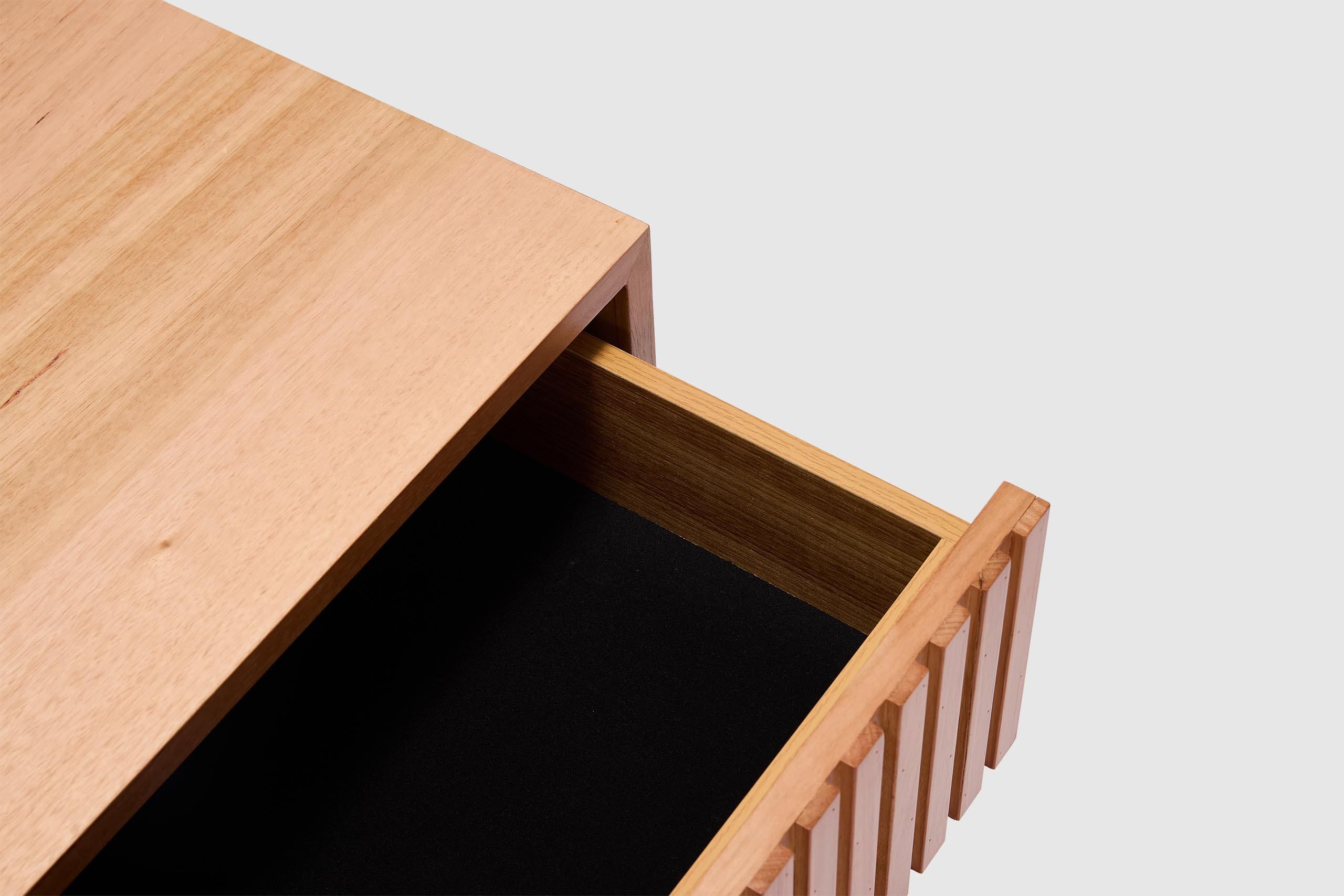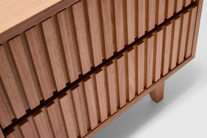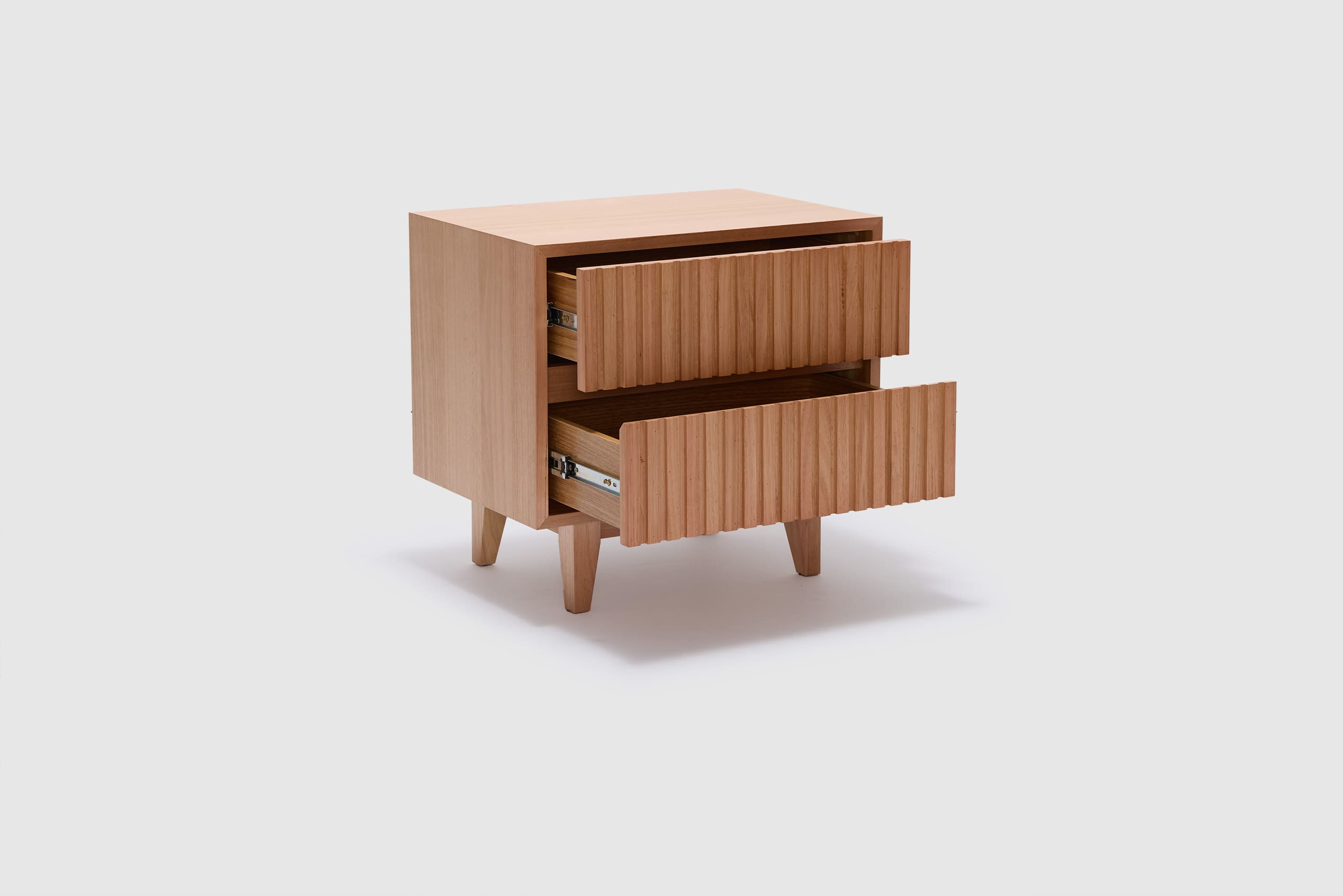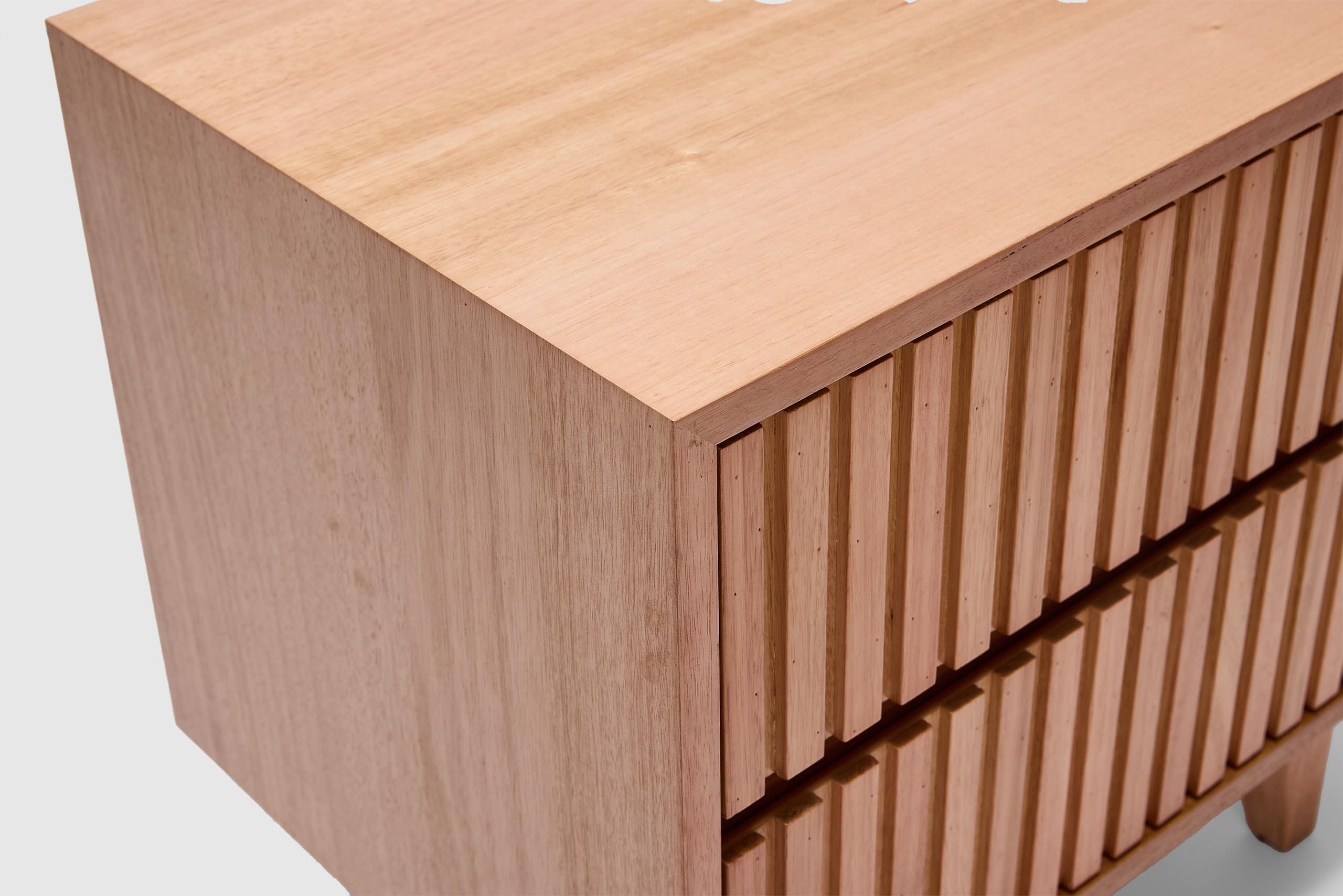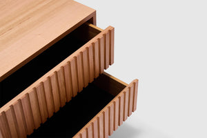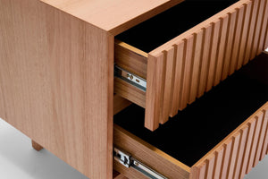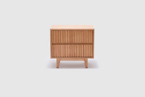 Introducing our Harlow Bedside Table, the perfect solution designed to meet your organizational needs. With its two drawers, on-trend ribbed finish, and Australian messmate timber construction, this bedside table combines functionality and modern design. It's the perfect addition to any bedroom or living space where storage is a priority.