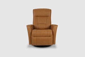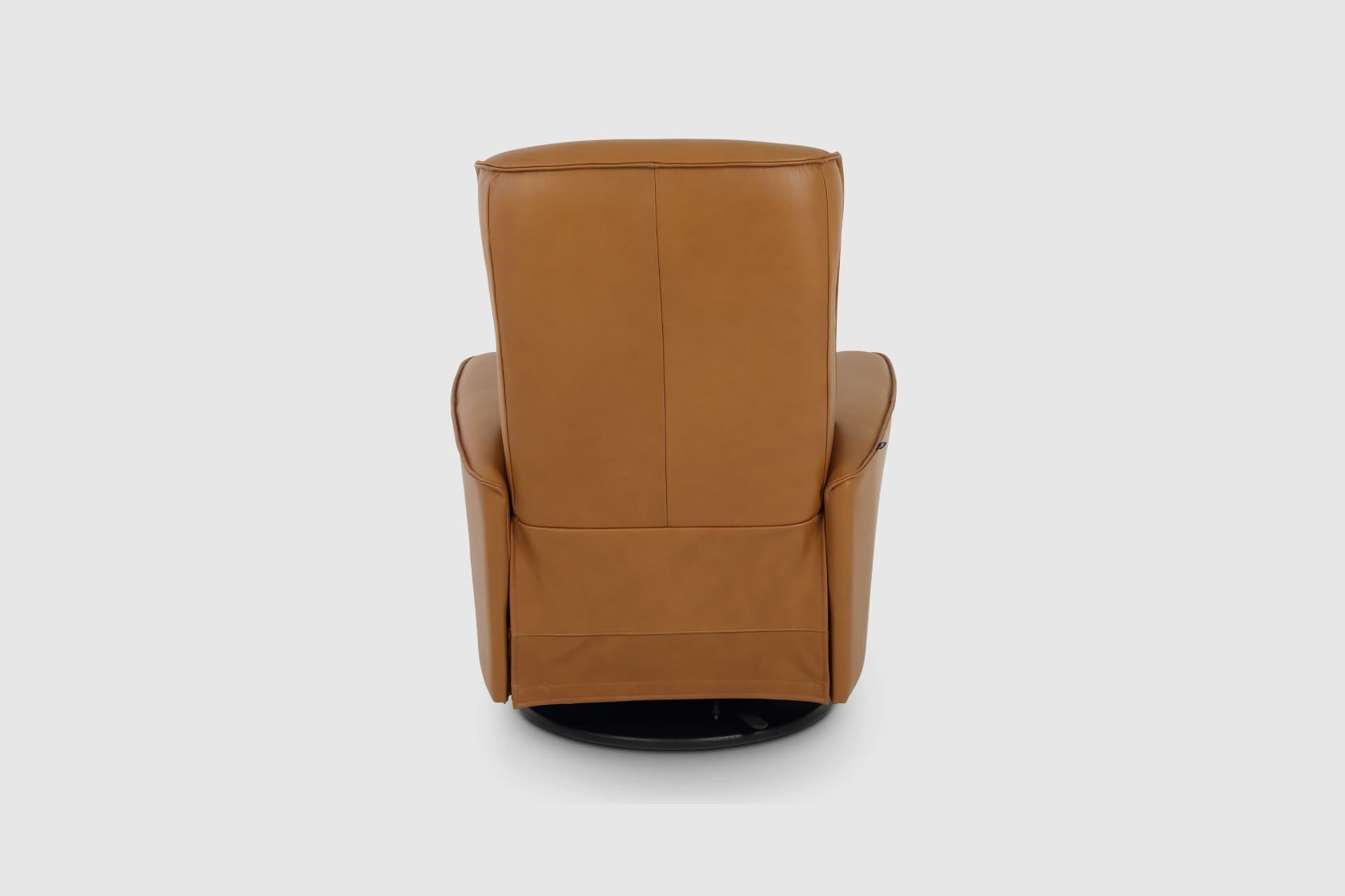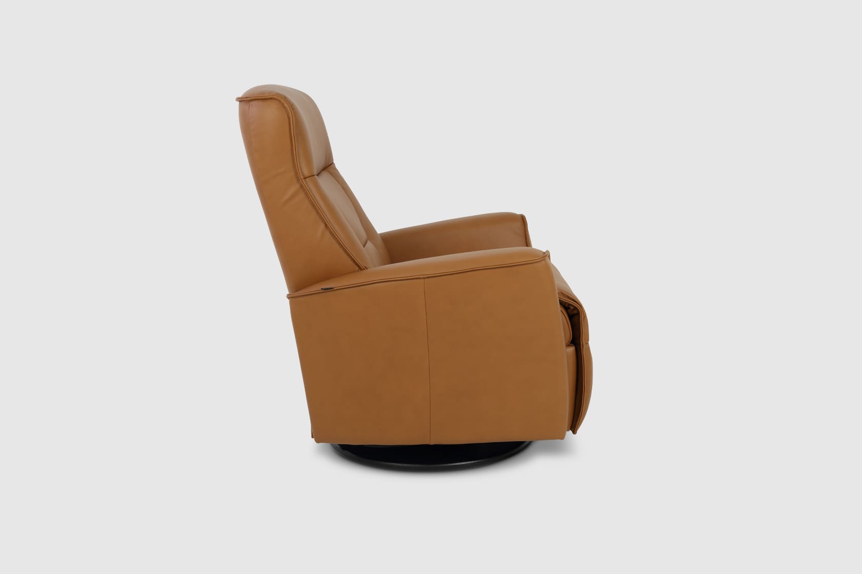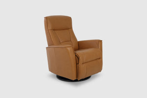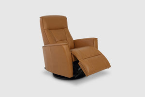 The Fjords Harstad swing relaxer, featuring manual release headrest angle, makes the seating experience ergonomic and gives your lower back correct support. Available in all our leathers and select fabrics, the Harstad is a swivel/glider/rocker recliner available in motorized and manual versions. The design is available in two sizes, large and small. Black Base is standard on Harstad.