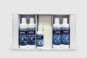 The Ultimate Leather Kit has features the following products to look after your leather at home; 2 x 250ml Leather Cleansing Shampoo, 2 x 250ml Leather Nourisher & Protector, 1 x 125ml Ultimate Ink Remover, an application cloth and application sponge.